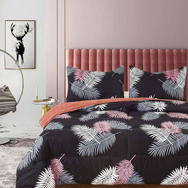 Edredón Queen estampado color negro y hojas de color blanco, rosado y gris